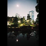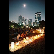 天に高く高くのぼった月。遠くにはビルの夜景。足下にあかり。都市のど真ん中に出現した光のコラボレーション