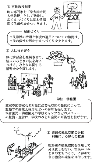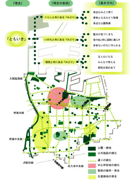 この計画は、みどりを主体としたまちづくりの方向性を定める、まちづくりマスタープランである。まず、策定手法として「オール泉大津」によることをめざした。それは、市の全行政部に上位・関連行政の参加を得て、委員会からワーキングまで、総勢60名に及ぶ検討会の活動によって実現可能となった。 調査段階では、現況調査に基づく課題の検討と、レクリエーションや自然環境に関する社会動向を調査した。